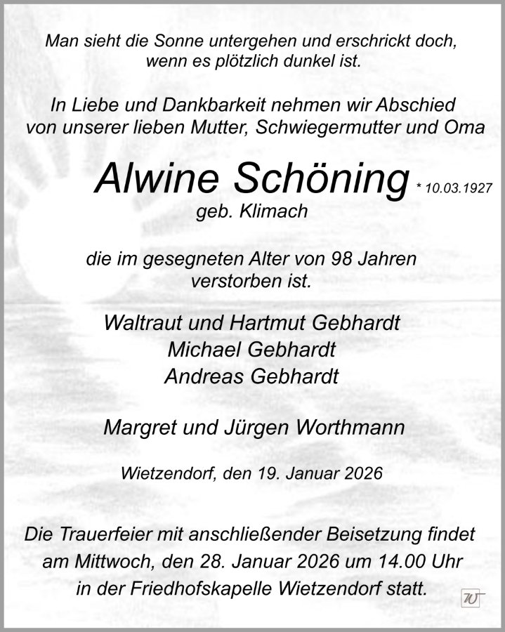 hier einfach meinen Dank für alles auszudrücken, das kann ich doch gar nicht. Es würde mich wochenlang an den Computer fesseln, so dankbar bin ich nicht nur für alles, sondern für Dich und dass es Dich gab. Ob als Kind, Jugendlicher oder Erwachsener das Haus im Bleekenweg zu betreten, es geschah immer in dem Bewusstsein, dass Ihr, also Du und Opa, da wart. Aber Ihr wart nicht nur einfach da, Ihr wart immer für UNS da. Ihr habt Euch uns immer mit viel Liebe und Aufmerksamkeit gewidmet. Dich nun auch nicht mehr bei mir zu haben, wird mich hier noch sehr lange traurig zurücklassen, doch bin ich auch froh und erleichtert, dass Du keine Qualen mehr leidest und dass Dir Schlimmeres erspart geblieben ist. Dich leiden zu sehen, war auch für mich sehr schwer.