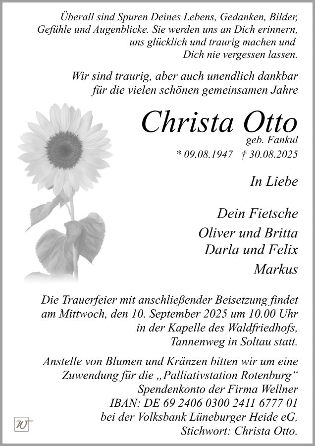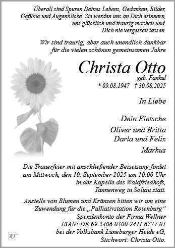 wir wünschen Ihnen von Herzen viel Kraft, dass Sie Menschen um sich haben, die Ihnen in dieser schweren Zeit beistehen und Halt geben. Zusätzlich können Sie auf dieser Gedenkseite Erinnerungen teilen und so das Andenken gemeinsam wachhalten.