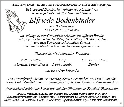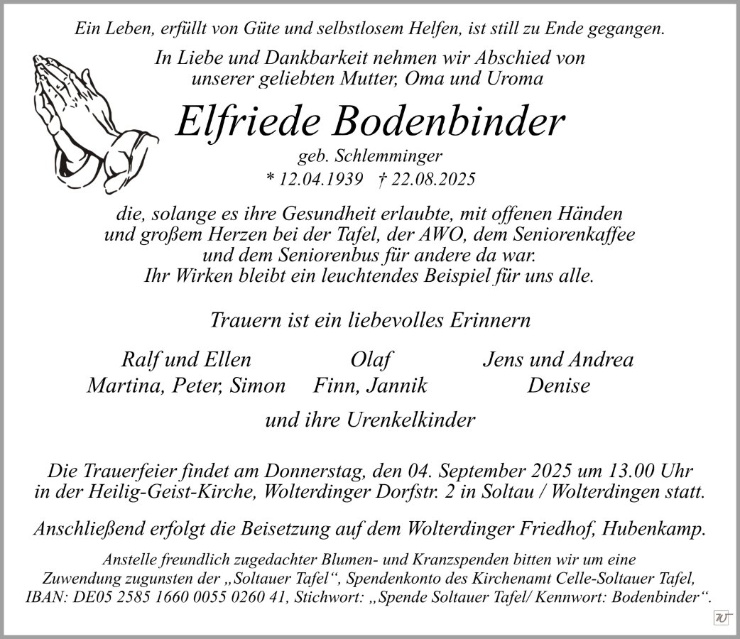 ist still zu Ende gegangen. In Liebe und Dankbarkeit nehmen wir Abschied von unserer Mutter, die mit offenen Händen und großem Herzen bei der Tafel, der AWO, dem Seniorenkaffee und dem Seniorenbus für andere da war.