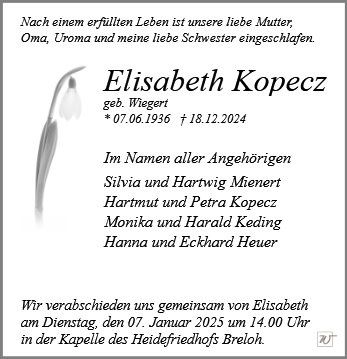 Ich habe viele fröhliche Momente mit Elisabeth erleben dürfen, an die ich mich gerne und oft erinnere. Ihnen als Angehörige wünsche ich viel Kraft für die kommende Zeit und dass auch eines Tages nur noch die schönen Erinnerungen ihr Herz erfüllen.