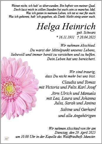 Frau Helga Heinrich geb. Schwarz