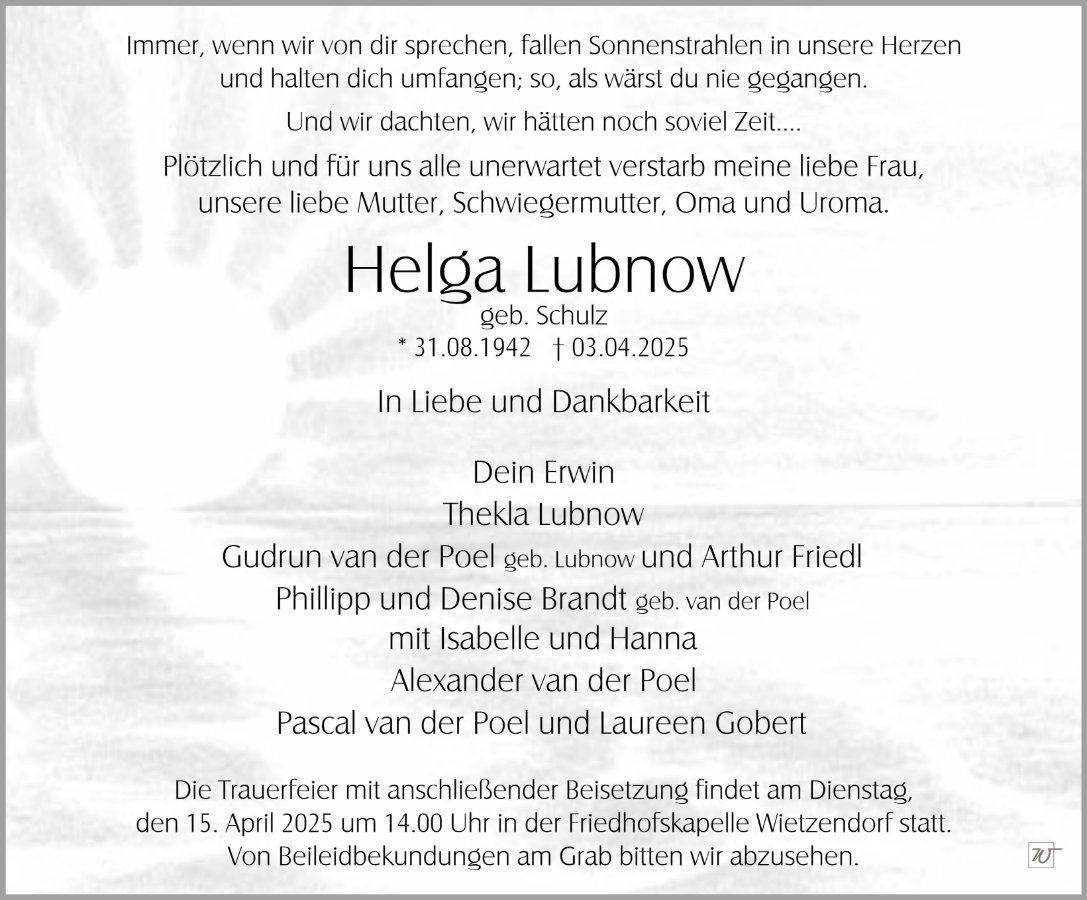 Frau Helga Lubnowgestorben am 3. April 2025