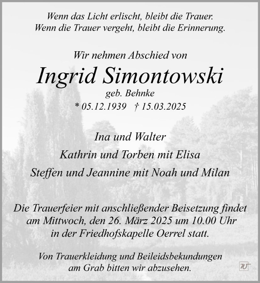 Frau Ingrid Simontowskigestorben am 15. März 2025