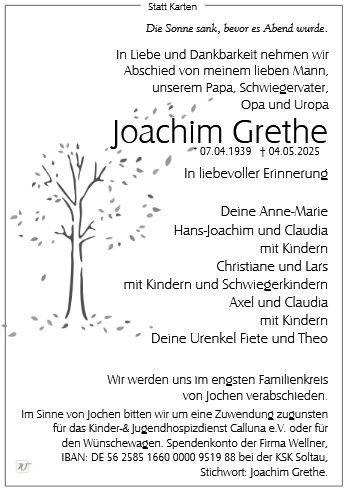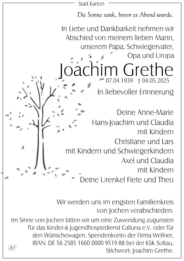 wir wünschen Ihnen für die kommende Zeit viel Kraft und dass es Ihnen gelingt, dankbar auf die positiven Erinnerungen zurückzublicken. Diese Gedenkseite möge Ihnen dabei helfen, Ihre Trauer zu teilen und das Andenken gemeinsam wachzuhalten.