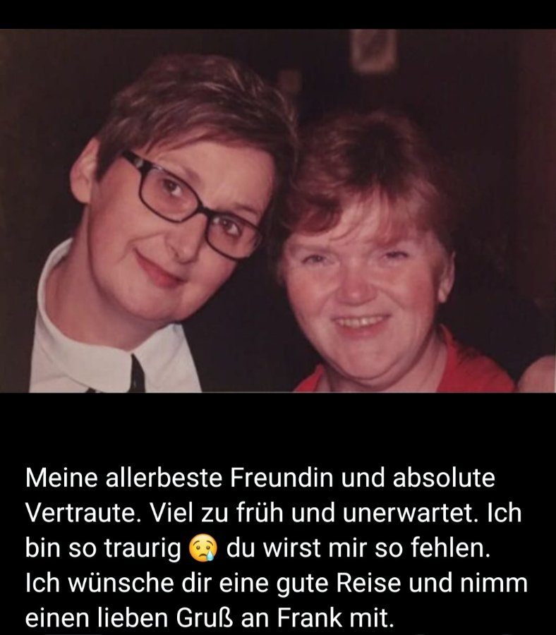 Ich möchte euch meine aufrichtige Anteilnahme zum Verlust eurer Mutter aussprechen. Für mich war eure Mutter die beste Freundin und Vertraute. Sie hat mich durch schwere Zeiten begleitet und hat meine Trauer, Wut und Ängste geteilt, so wie ich ihre Trauer, Wut und Ängste geteilt habe. Es war alles so viel einfacher, wenn man mit jemandem darüber sprechen konnte, der einem einfach nur zuhören und mit einem gelitten hat. Den Verlust meines Enkels haben wir beide beweint. Wir hatten darüber gesprochen, dass wir sein Grab besuchen werden, wenn endlich der Schnee weg ist und sie ohne Hilfsmittel wieder laufen kann. Das war ihr größtes Ziel, wieder richtig laufen können, damit sie die Pflege ihrer Mutter wieder aufnehmen kann. Eure Mutter hat nie an sich gedacht. Ihre Gedanken kreisten um euch und ihre Mutter. Ich wünschte, ich hätte mehr Zeit gehabt mich von ihr zu verabschieden. Nochmal in Erinnerungen schwelgen. Ich habe ihr noch so viel zu sagen und würde so gerne einfach nur zum Handy greifen und sie anrufen. Sie fehlt mir so sehr und ich wünschte ich könnte nochmal mit ihr ins Kino gehen.