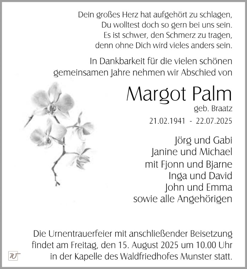 wir wünschen Ihnen von Herzen viel Kraft, dass Sie Menschen um sich haben, die Ihnen in dieser schweren Zeit beistehen und Halt geben. Zusätzlich können Sie auf dieser Gedenkseite Erinnerungen teilen und so das Andenken gemeinsam wachhalten.