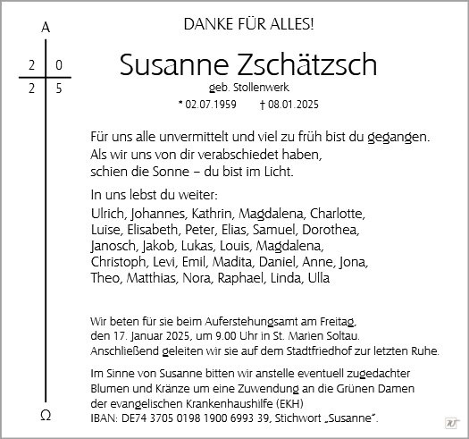 Liebe Susanne, Wir vermissen dich, deine Warmherzigkeit, dein Strahlen, deine Fröhlichkeit. Wenn wir zum Himmel schauen, leuchtet dein Stern besonders hell. Danke für alles. Die Grünen Damen und Herren aus Goslar.